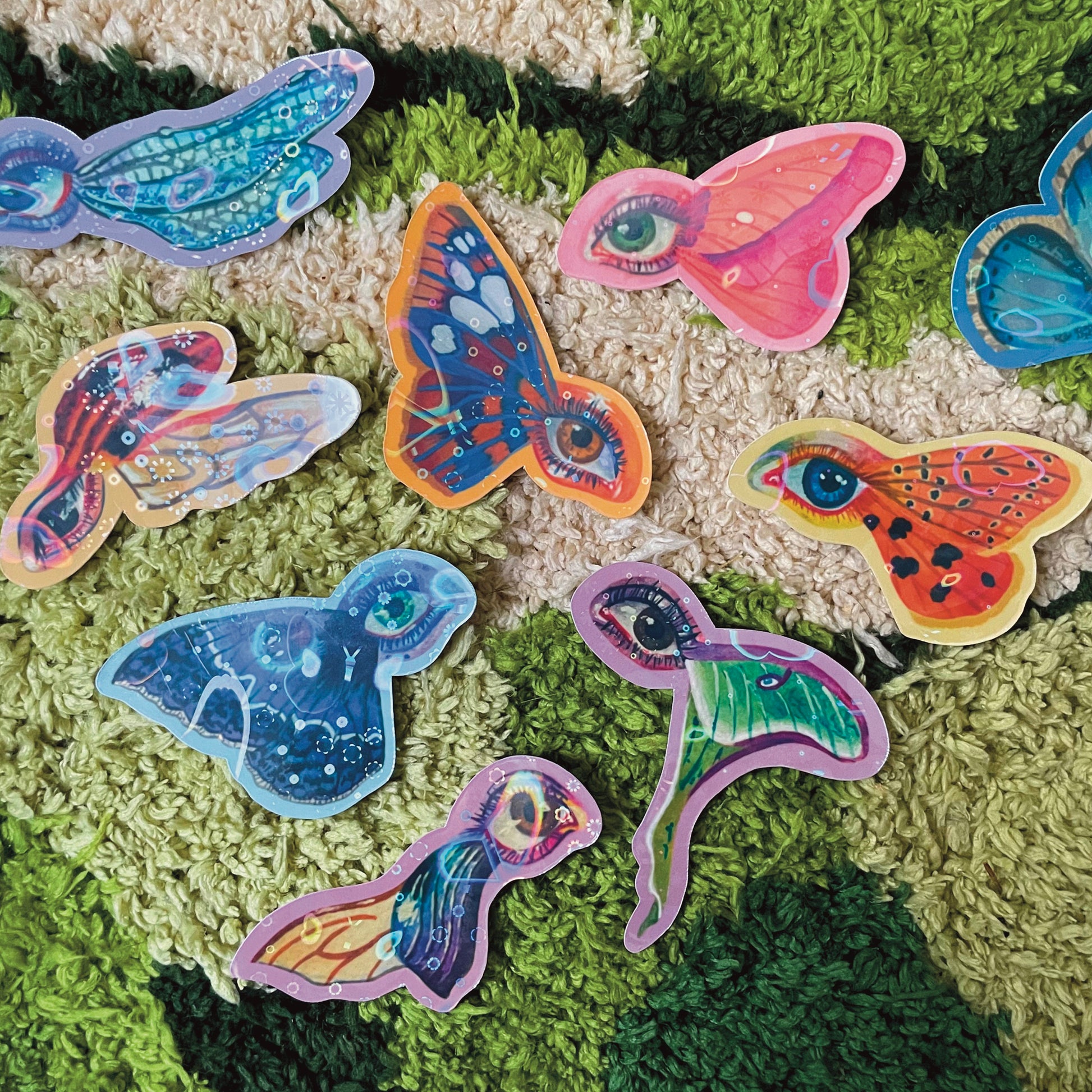 A set of 9 Holographic stickers to bring extra magic to your daily life or sparkle to your collection. They’re inspired by real life insects reflecting on nature’s beauty and its shapes, colours and patterns.